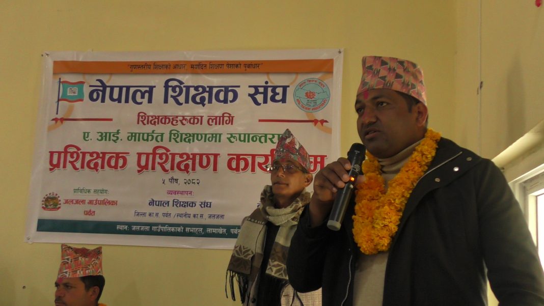 नेपाल शिक्षक सङ्घ गण्डकी प्रदेश कार्यसमितिको आयोजना तथा जलजला गाउँपालिकाको प्राविधिक सहयोगमा शनिवार आयोजना भएको प्रशिक्षक प्रशिक्षण कार्यक्रममा बोल्दै उनले यस्तो बताएका हुन् । ए.आई.को प्रयोगमार्फत शिक्षणमा रूपान्तरण गर्नका लागि शिक्षकहरूको लागि आयोजना भएको कृत्रिम बौद्धिकतासम्बन्धी तालिम सञ्चालन गरिएको हो । प्रविधि विकाससँगै विद्यार्थीहरू पनि प्राविधिक रूपमा सिक्न सक्षम रहेकोले शिक्षकहरुले पनि आफ्नो क्षमता अभिवृद्धि गर्नुपर्ने अध्यक्ष आचार्यले बताए ।