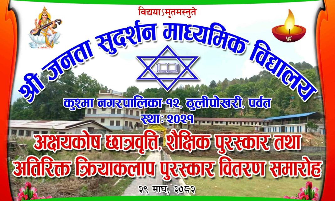 पर्वत : पर्वतको कुस्मा नगरपालिका १२ ठुलीपोखरीमा अवस्थित जनता सुदर्शन माध्यमिक विद्यालयमा बिहीबार एक समारोहकाबीच पुरस्कार तथा छात्रवृत्ति वितरण समारोह सम्पन्न भएको छ ।